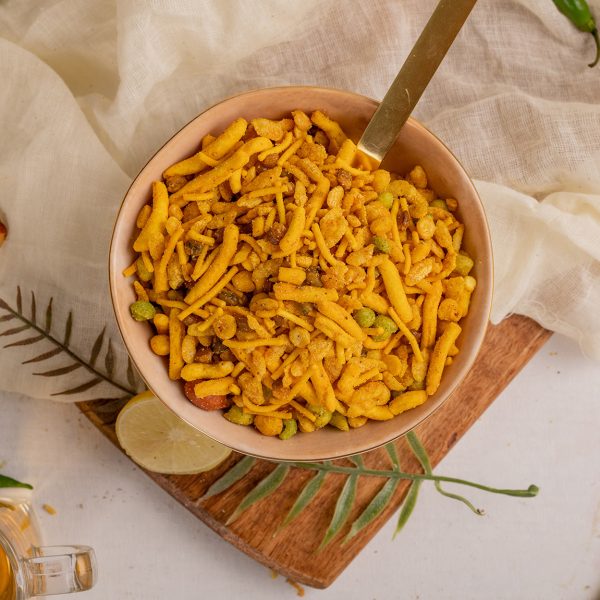 Gram Flour (16%), Edible Oil, Corn Flakes (8%), Rice Flakes (6%), Peanuts (4%), Gram Pulse (3%), Lentil (3%), Sugar (2%), Chilli Powder (1%), Iodized Salt, Black Salt, Carom Seeds, Coriander, Turmeric Powder, Dry Mango Powder, Fennel, Cumin, Bay Leaves, Cinnamon, Nutmeg, Mace, Clove, Black Pepper, Stone Flowers, Pomegranate, Mint Leaves, Bishop’s Weed, Dry Ginger, Long Pepper, Compounded Asafoetida, Curry Leaves, Raising Agent [E500(ii)] and Acidity Regulator (E330).