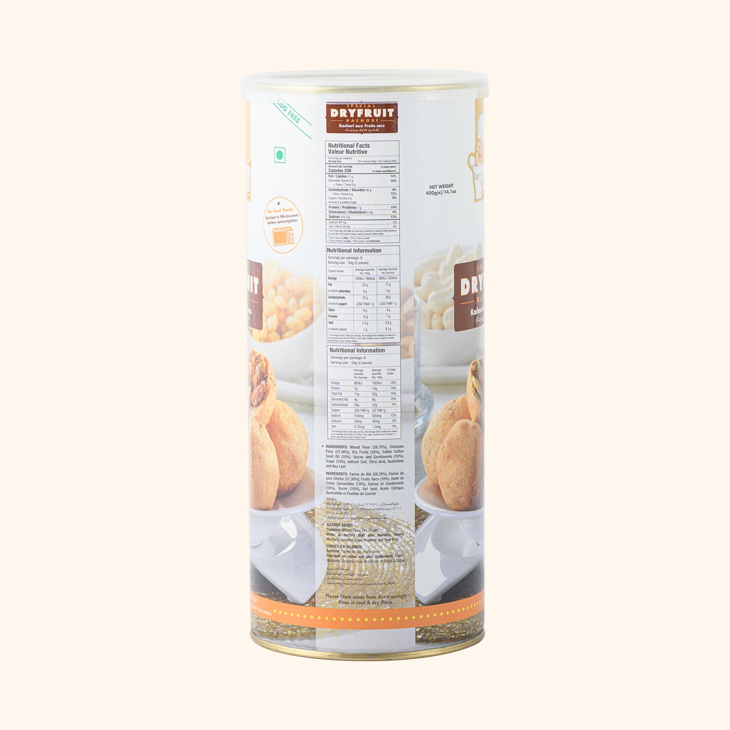 Product Name : DRY FRUIT KACHORI (200g) Nutrition Facts Valeur nutritive 4 Servings per container Serving Size Per 2 pieces (50 g) / Par 2 pièces (50g) Amount per serving % Daily Value * Calories 230 % Valeur quotidienne * Fat / Lipides 11 g 14% Saturated/ saturé 4 g 18% + Trans / trans 0 g Carbohydrate / Glucides 26 g 9% Fibre /Fibres 4 g 12% Sugars / Sucres 3 mg 0% Includes 0 g added sugar Protein / Protéines 7 g 14% Cholesterol / Cholestérol 0 mg 0% Sodium 310 mg 13% Calcium 20 mg 2% Iron / Fer 0.75 mg 4% * The % Daily Value (DV) tells you how much a nutrient in a serving of food contributes to a daily diet. 2000 calories a day is used for general nutrition advice. * 5% or less is a little, 15% or more is a lot *5% ou moins c’est peu, 15% ou plus c’est beaucoup