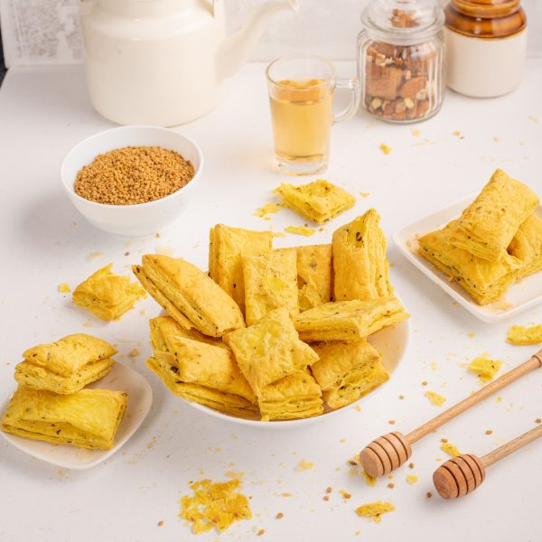 Refined Wheat Flour (62%), Edible Vegetable Fat (Palmolein) (33%), Sugar (1%), Edible Iodized Salt(1%), Kasuri Methi (0.7%), Edible Turmeric Powder (0.6%), Synthetic Food Color