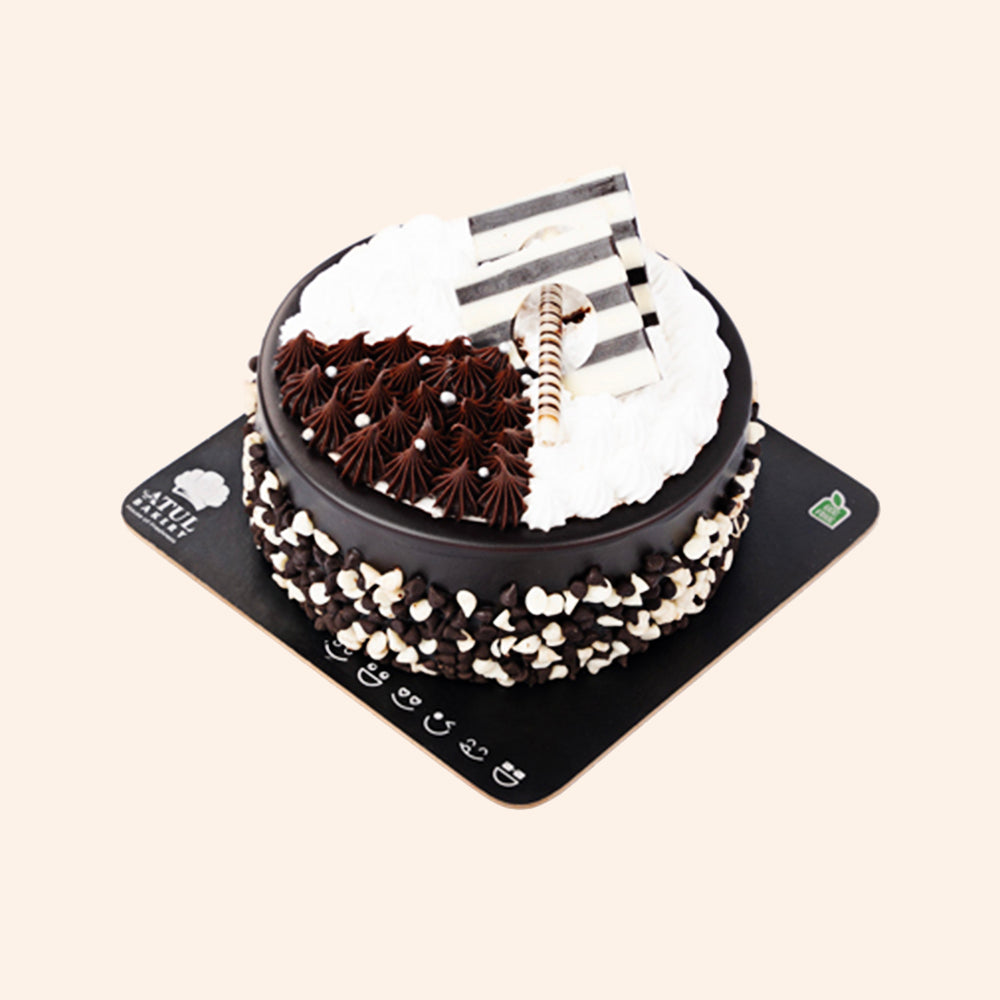 Chocolate Sponge, Sugar Syrup, Dark Chocolate Truffle, Vanilla Cream Layering, Vanilla Cream Icing, Black & White Choco Chips, Chocolate Garnishing