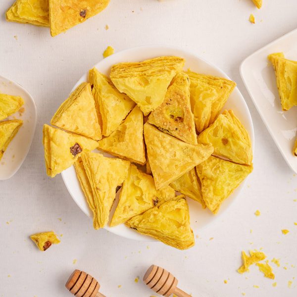 A puff pastry filled with a savory onion filling, perfect for snacking