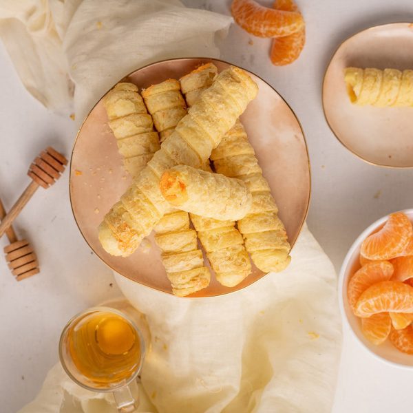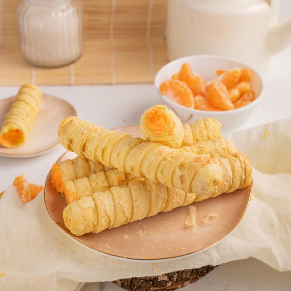 Moist and citrusy orange flavored sponge cake, filled with a creamy center.
